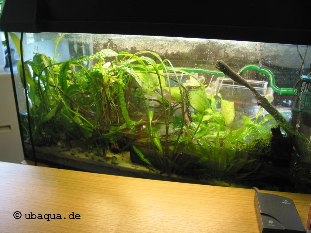Das fast leere Aquarium wurde dann auf den Schreibtisch gestellt, damit Platz für den Aufbau des neuen Aquariums war.