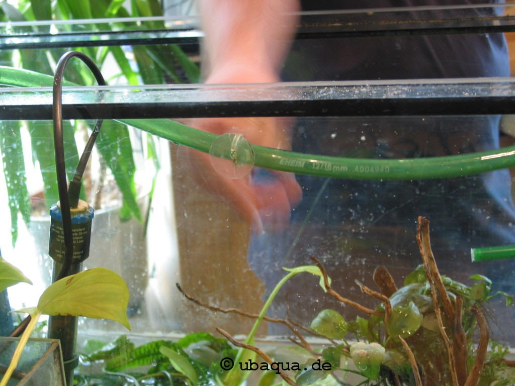 Der Filter kommt hinter die Matte mit einer Führung des Schlauches über die Matte.