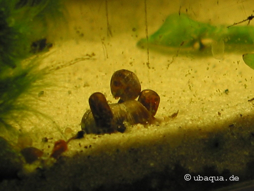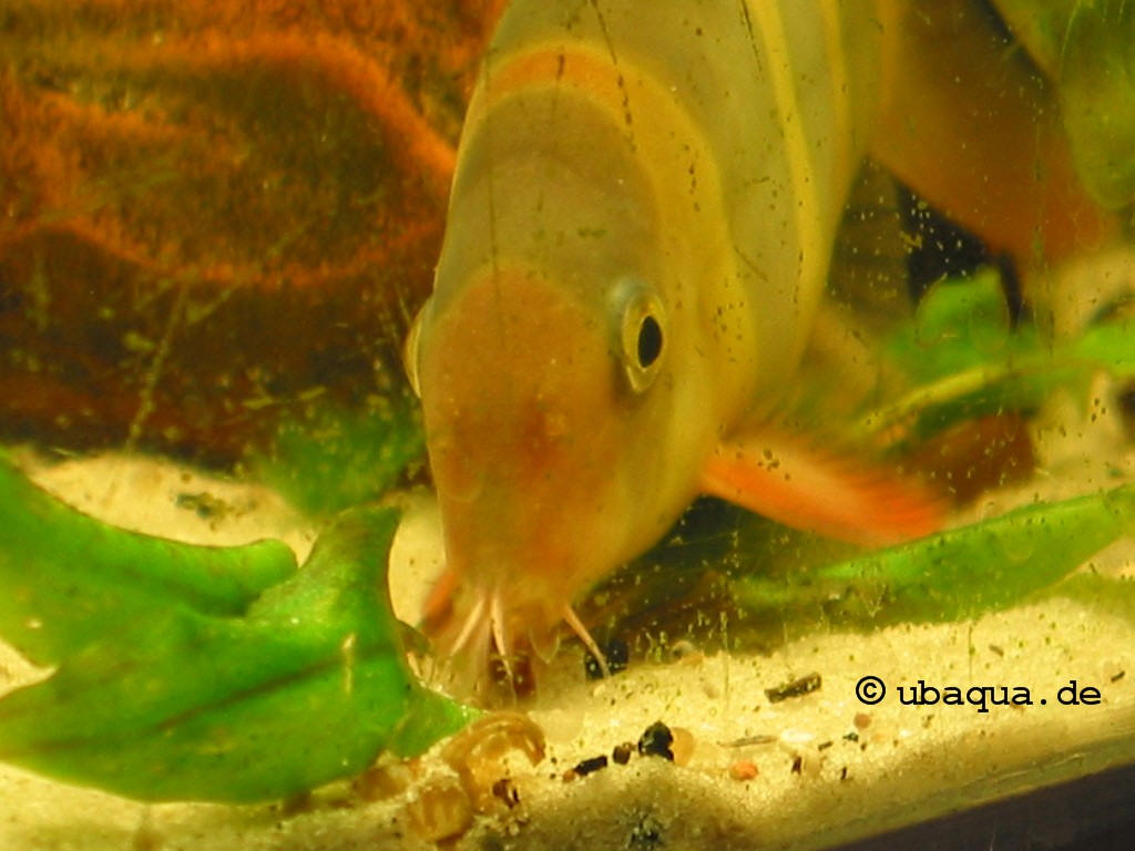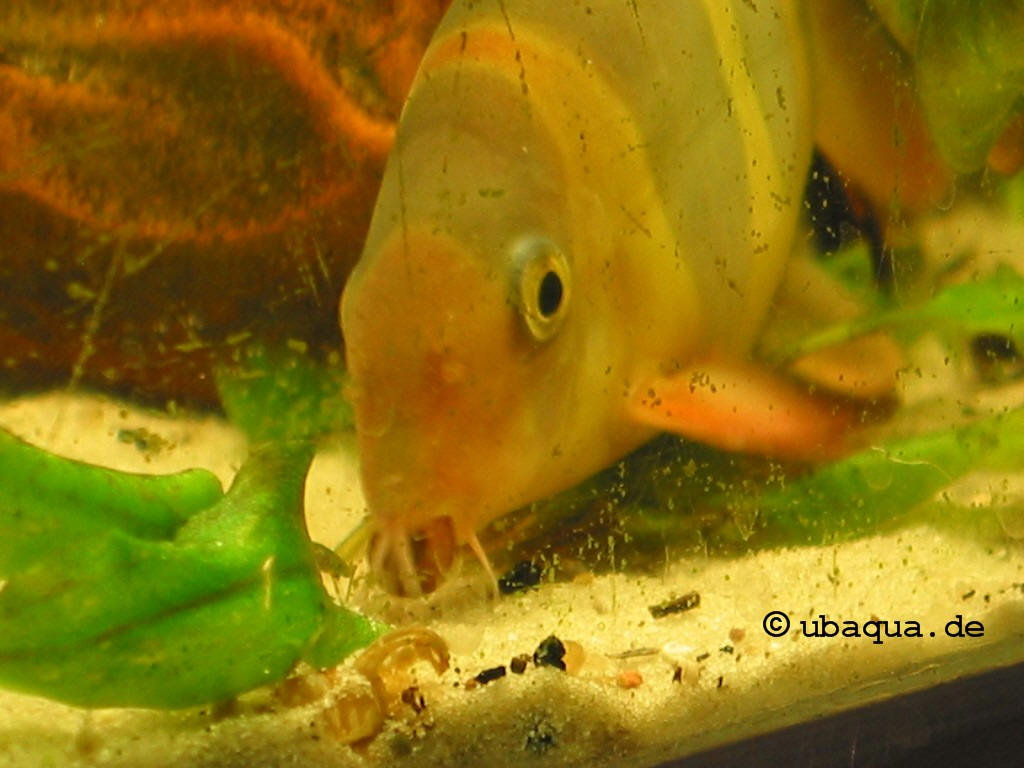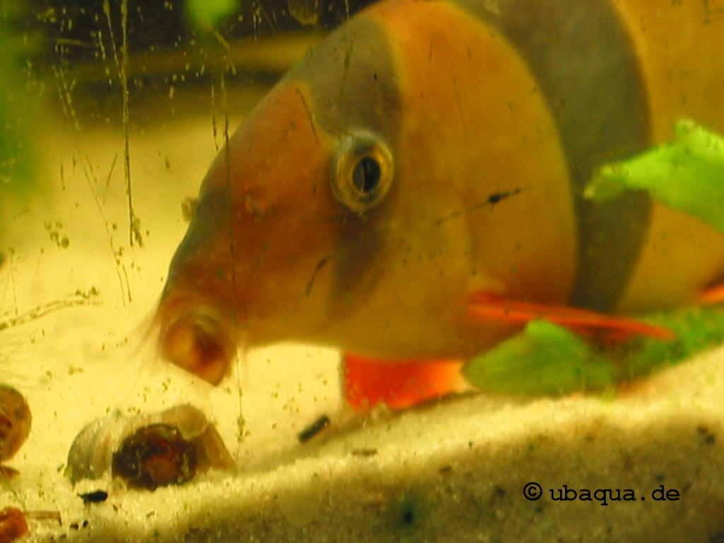 Bitte überlegt es Euch ganz genau, ob ihr diese Tiere pflegen wollt, es ist kein „Nutzfisch“, sondern ein wirklich schöner Fisch, der auch vom Verhalten her sehr schön ist zu beobachten. Umsonst wird er nicht auch „Clownfisch“ genannt. Außerdem…. wenn alle Schnecken vertilgt sind, ist es ganz wichtig, neue Schnecken als Futter nachzuliefern. Also ist eine Schneckenzucht unumgänglich. Auf den nachfolgenden Fotos habe ich gerade ein paar Schnecken ins Becken geworfen und diese werden sofort von den Prachtschmerlen gefunden und verspeist. Bitte nicht über die Scheibe wundern, die war zur Fotosession gerade nicht geputzt..... ;-(
